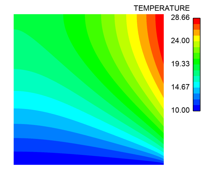 The left figure describes the configuration of the test case. The system to be simulated is a solid square with one edge having a known temperature. Another edge has a convective exchange with a fluid whose temperature is also known. The two other edges are adiabatic. The right image illustrates the temperature field corresponding to this configuration at steady state.